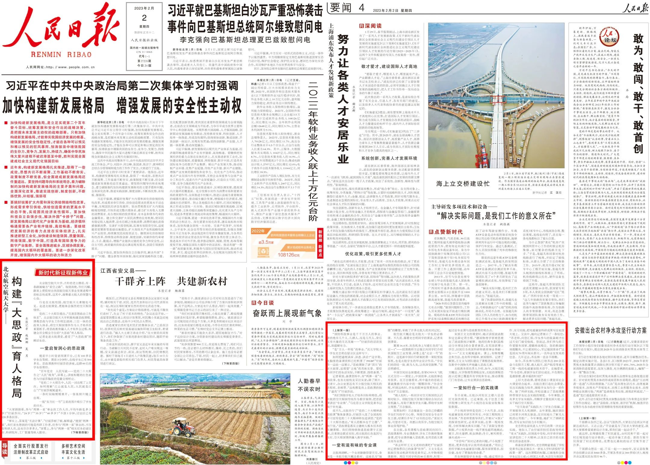 育才造士,为国之本。党的二十大作出关于“完善思想政治工作体系”的战略部署,习近平总书记就思想政治工作发表一系列重要论述,作出一系列重要指示批示,为我们开展工作提供了根本遵循。学校坚持将思想政治工作作为各项工作的生命线,传承弘扬以“空天报国”为内核的北航精神,统筹用好校内校外、线上线下、各行各业等育人资源,推进思政课程与课程思政、课上与课下、校内与校外、网上与网下育人资源的互融互动,以一流理念、一流团队、一流平台、一流服务、一流文化培养一流人才。