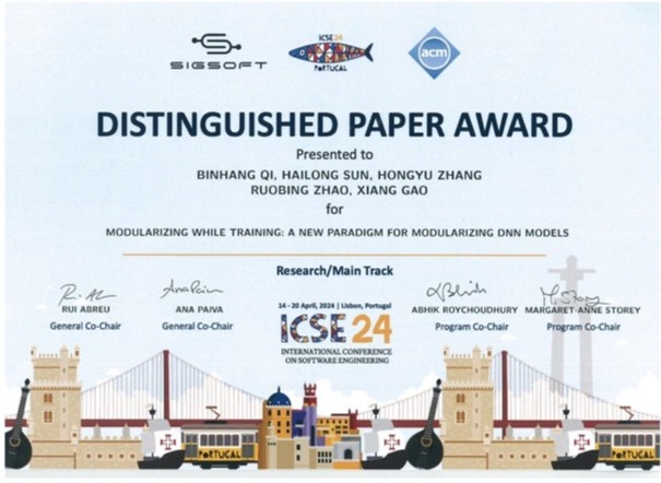 在本届SANER会议中,英国威廉集团官网硕士生洪硕作为第一作者的论文“Investigating and Detecting Silent Bugs in PyTorch Programs”荣获IEEE Computer Society TCSE Distinguished Paper Award。在本届ICSE会议上,英国威廉集团官网博士生齐斌航作为第一作者的论文“Modularizing while Training: A New Paradigm for Modularizing DNN Models”荣获ACM SIGSOFT Distinguished Paper Award。这是北航首次以第一作者单位在SANER和ICSE会议上获得该类奖项。