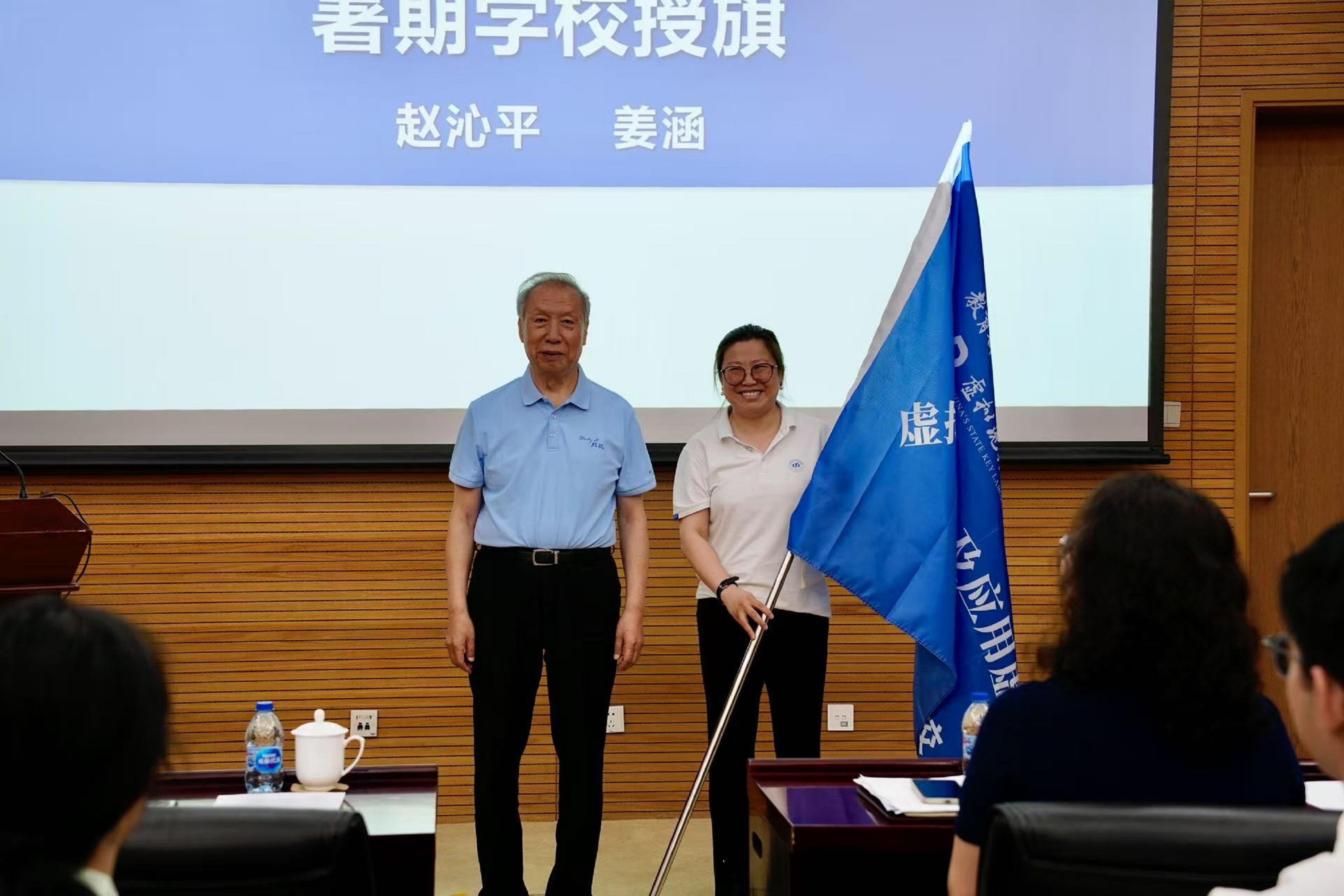 中国工程院院士赵沁平为暑期学校授旗,象征虚拟现实技术教研的薪火传递。