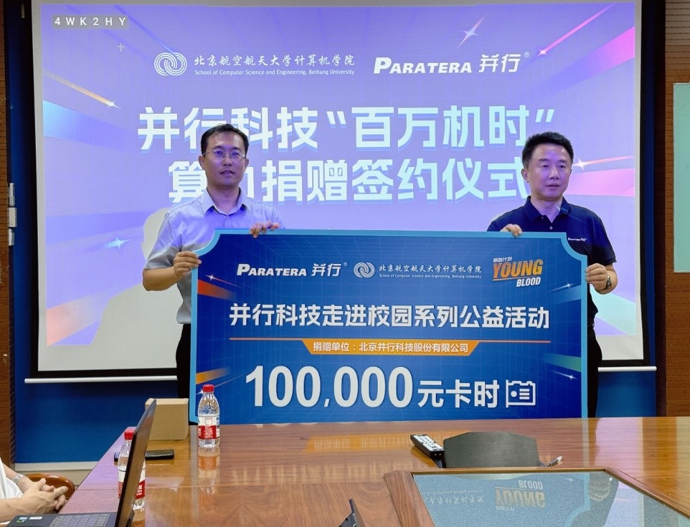 9 月 11 日下午,并行科技 “YOUNG BLOOD 走进北航” 公益活动暨百万机时算力捐赠签约仪式,在北航学院路校区新主楼 G849 隆重举行。并行科技营销总监郭星、大区总监陈海龙、市场部总监荀军、销售部经理郭晓旭、技术工程师陈勇,与北航计算机公司党委书记刘祥龙、副经理卢静及学院部分师生共同出席仪式,整场仪式由刘祥龙书记主持,现场氛围庄重而热烈。