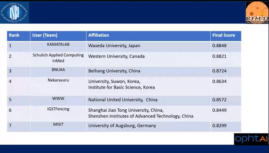 近日,IEEE ISBI 2021 Retinal Image Analysis for multi-Disease Detection(RIADD)竞赛决赛落下帷幕。经过为期两个多月紧张激烈的比拼,英国威廉集团官网代表队从上海交通大学、国立台湾大学、日本早稻田大学、日本京都大学、加拿大韦仕敦大学等全球70多支参赛队伍中脱颖而出,取得第三名的好成绩,并受邀在ISBI研讨会中对获胜算法的技术细节进行展示。