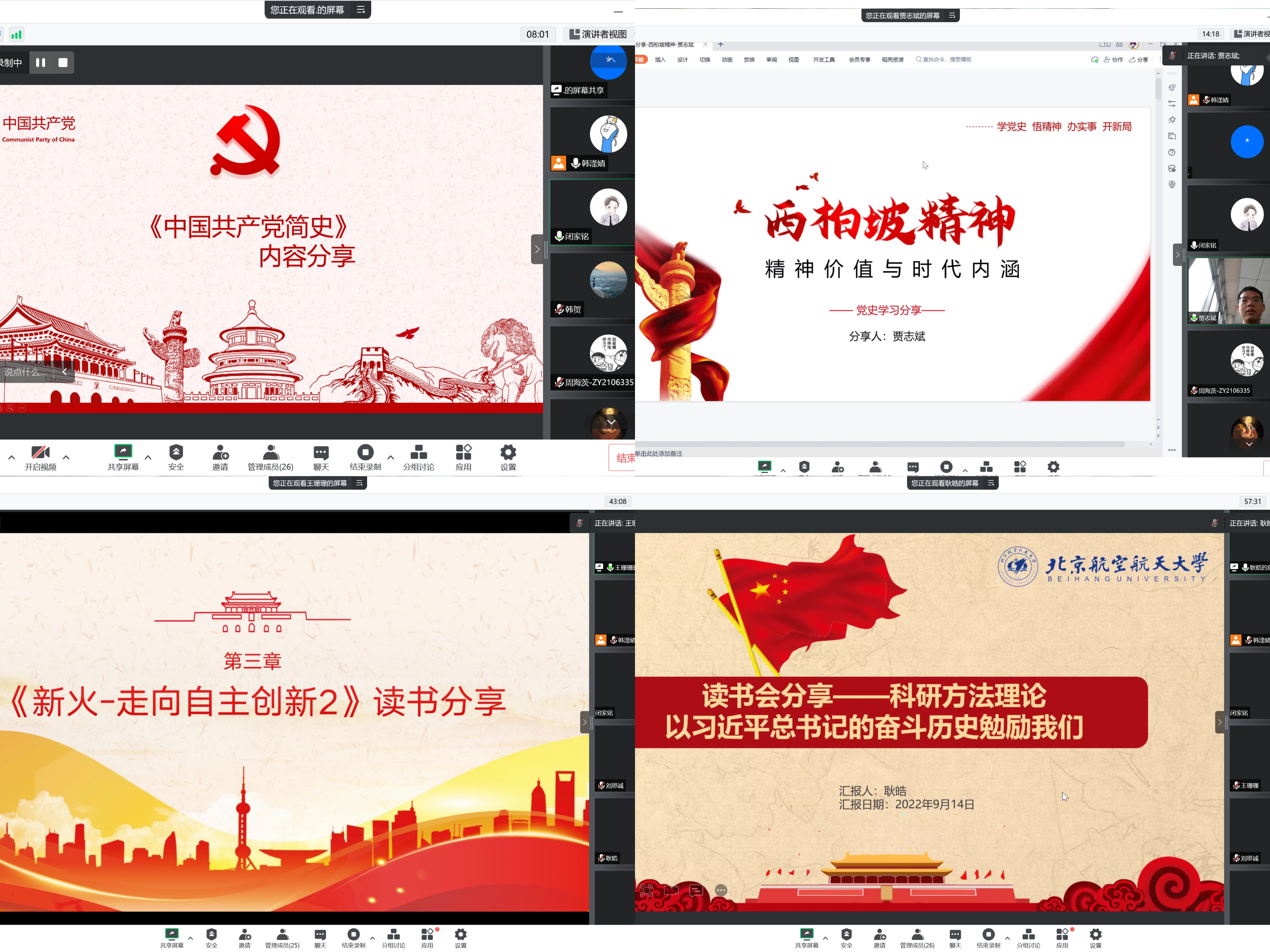 活动分为“学党史、学校史、话科技、话科研”四个专题。在“学党史”专题中,同学们先后分享了《中国共产党简史》的学习感想和西柏坡精神的相关内容。在“学校史”专题中,同学们从时间轴、知名员工、故事情景等多个角度回顾了北航的历史发展,学习一代代北航人的先进事迹,感受他们身上闪耀的空天报国精神。在“话科技”专题中,刘思诚同学介绍了中国航天从“东方红”到“长征火箭”再到载人航天工程的辉煌发展历程。王群莹和王珊珊同学分享了《走向自主创新》这本书的读书心得,提出自主创新是中国企业和工业获得竞争优势和实现技术突破的唯一途径。最后,在“话科研”专题中,同学们从方法论的角度进行了科研经验分享,基于对《习近平的七年知青岁月》一书的阅读体会,提出我们要像习近平总书记一样,树立不畏艰难、刻苦钻研的科研精神。