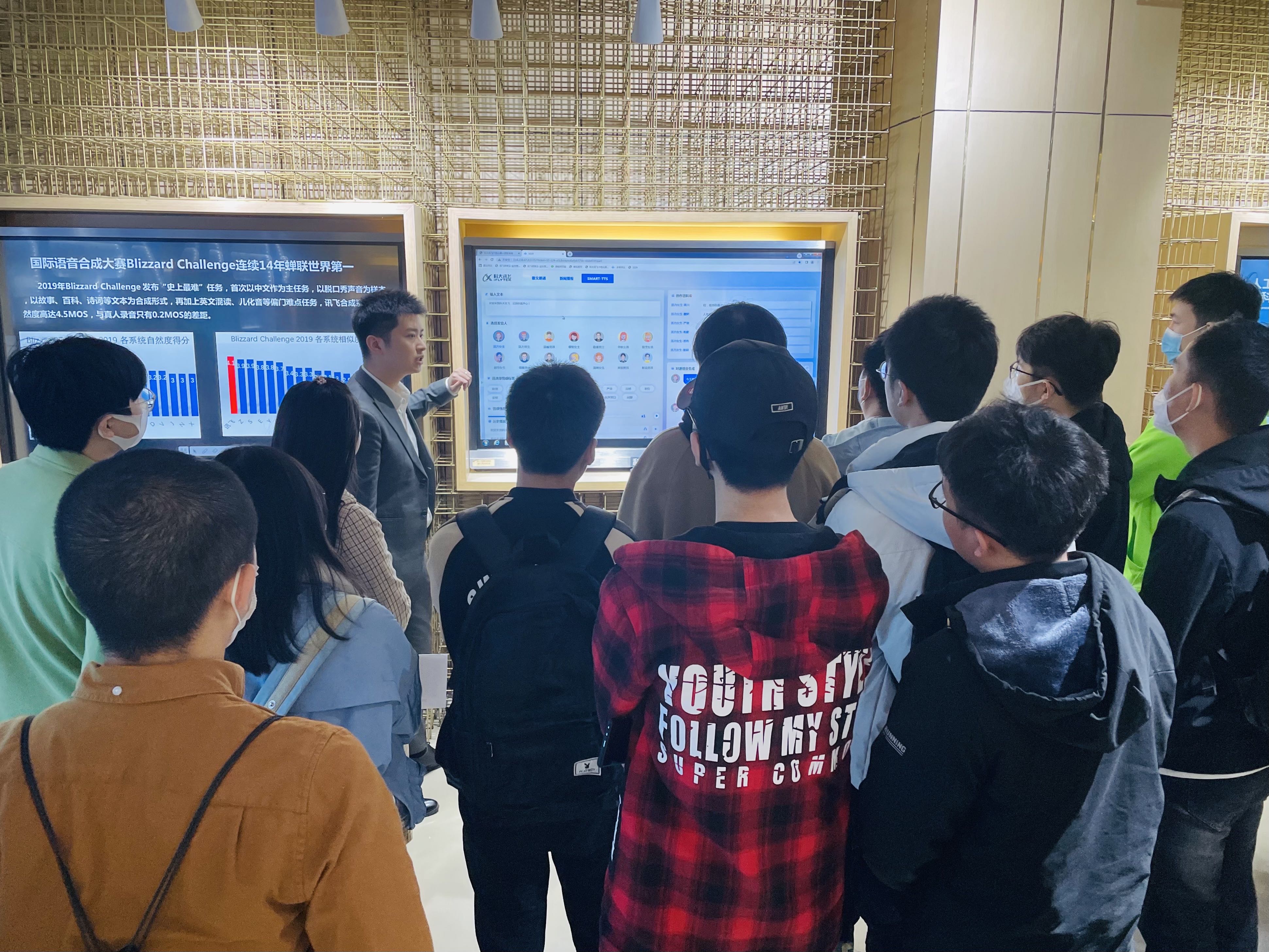 在科大讯飞北京总部,大家首先参观了人工智能体验中心。体验中心讲解员为大家详细、全面地介绍了科大讯飞作为一家优秀的科技企业和老员工创业模范企业在语音合成、语音播报、即时机器翻译、智能会议、智慧医疗、智能教学等人工智能应用场景取得的技术突破,同时邀请大家亲身体会了科大讯飞各类产品。